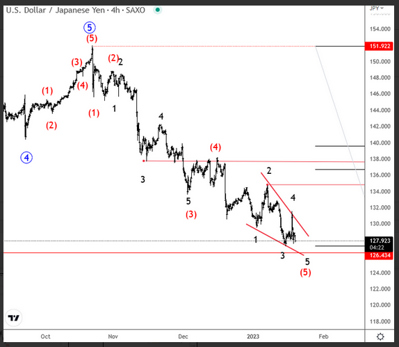 美元兑日元在2022年底下跌,在去年12月日本央行调整收益率曲缐控制框架(YCC)后最后几周跌至更低水平,价格突破了第4浪,跌穿了135的水平,让空头回归,可能是下跌推动浪的最后第五浪,现在可以在126区域完成。这是从152.00?始下跌推动浪的最后一个阶段,所以要注意将演变成一个调整,如果价格突破楔形形态,可能仍是本月。突破楔形将导致价格三浪反弹重返135-138的阻力区域,从该区域?始,汇价料恢复跌势。