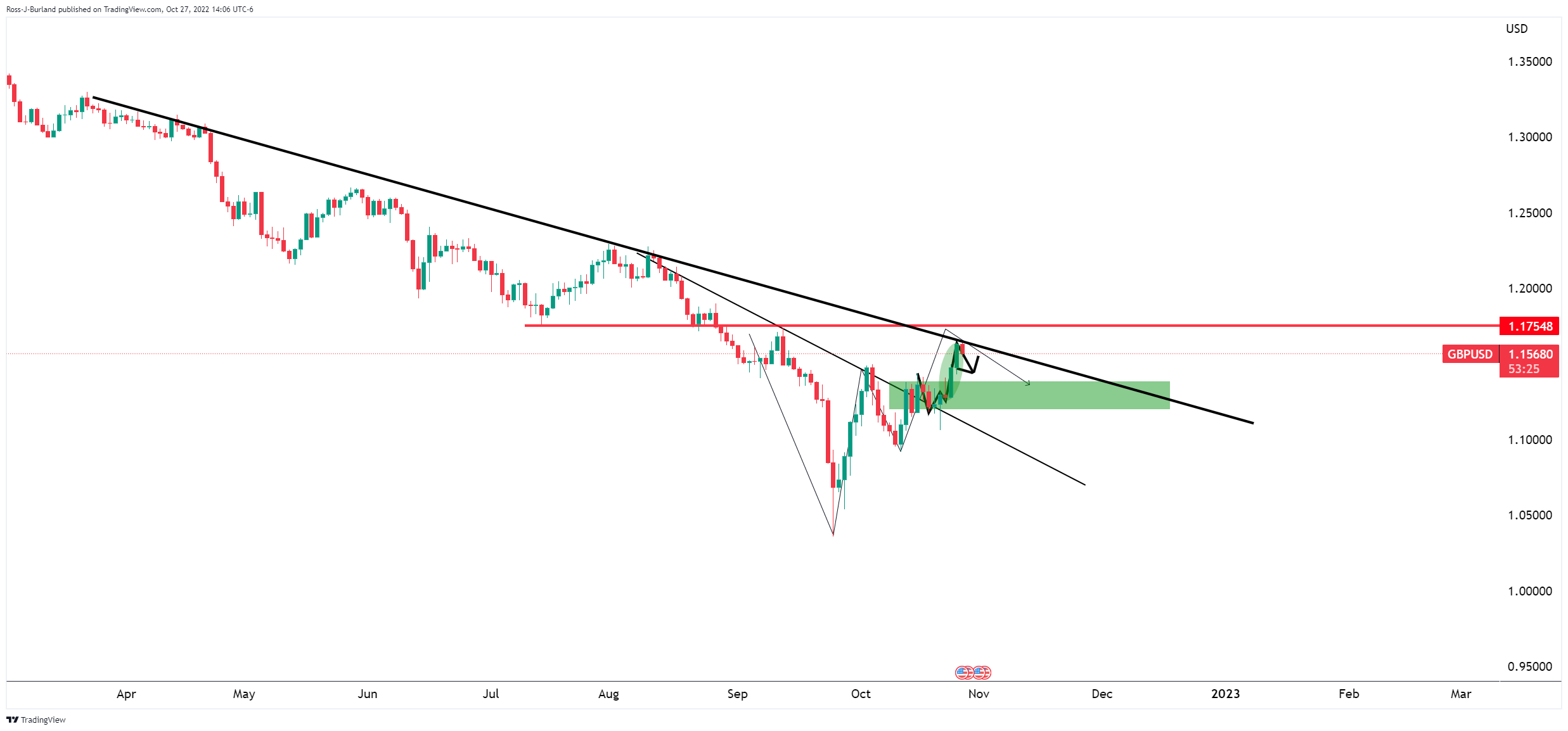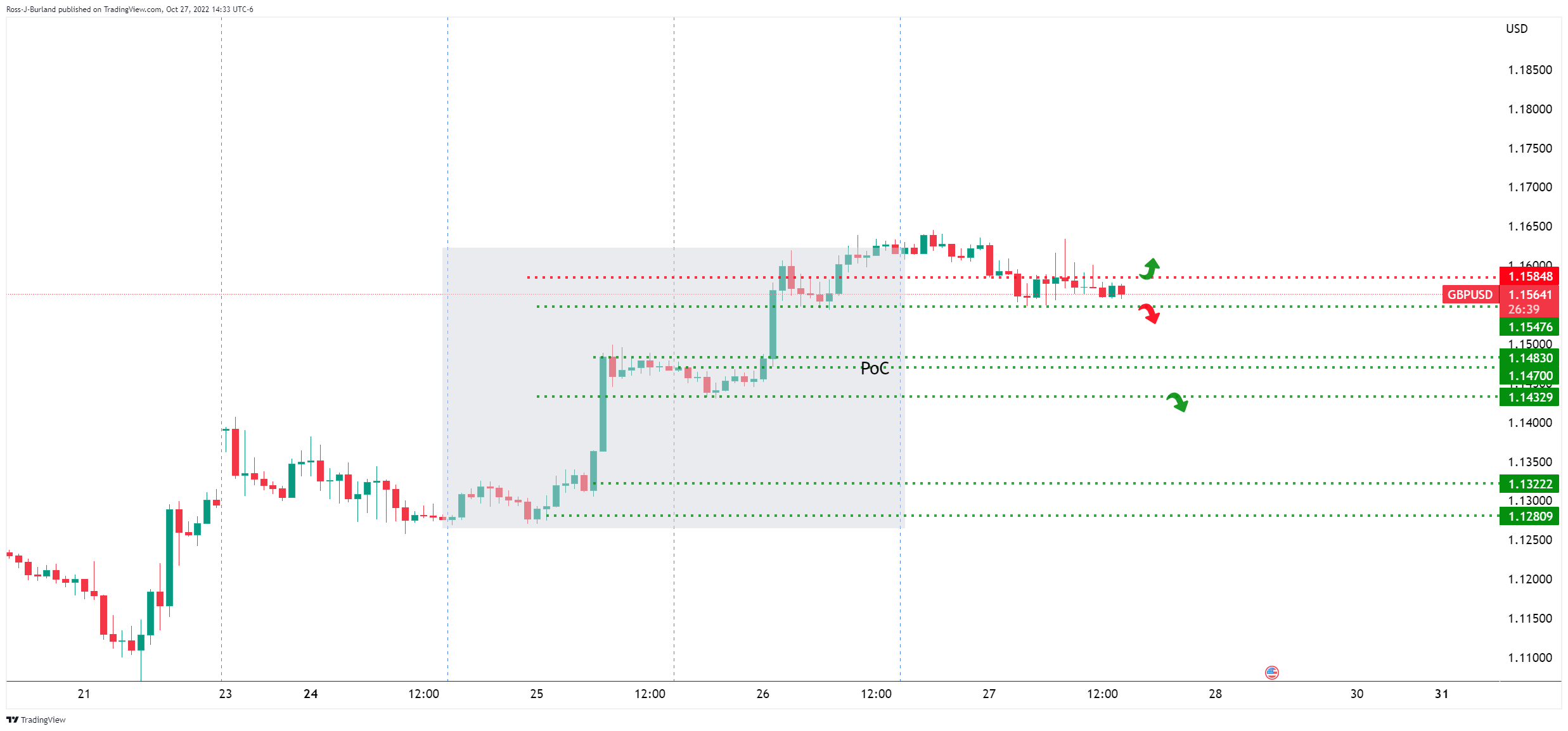英镑总体趋势下方的多头仍未结清,但多头可能还没有认输。英镑/美元关键水平处在 1.1470,但抛售势头,尚未跌破?1.1550 的关键支撑结构。以下按照日图和小时图对技术形态进行分析。