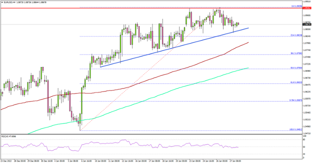 下跌方面,重要支撑位于1.0800和100小时均缐(红色,4小时图)。若跌破1.0800区域,将推动该货币对下跌。