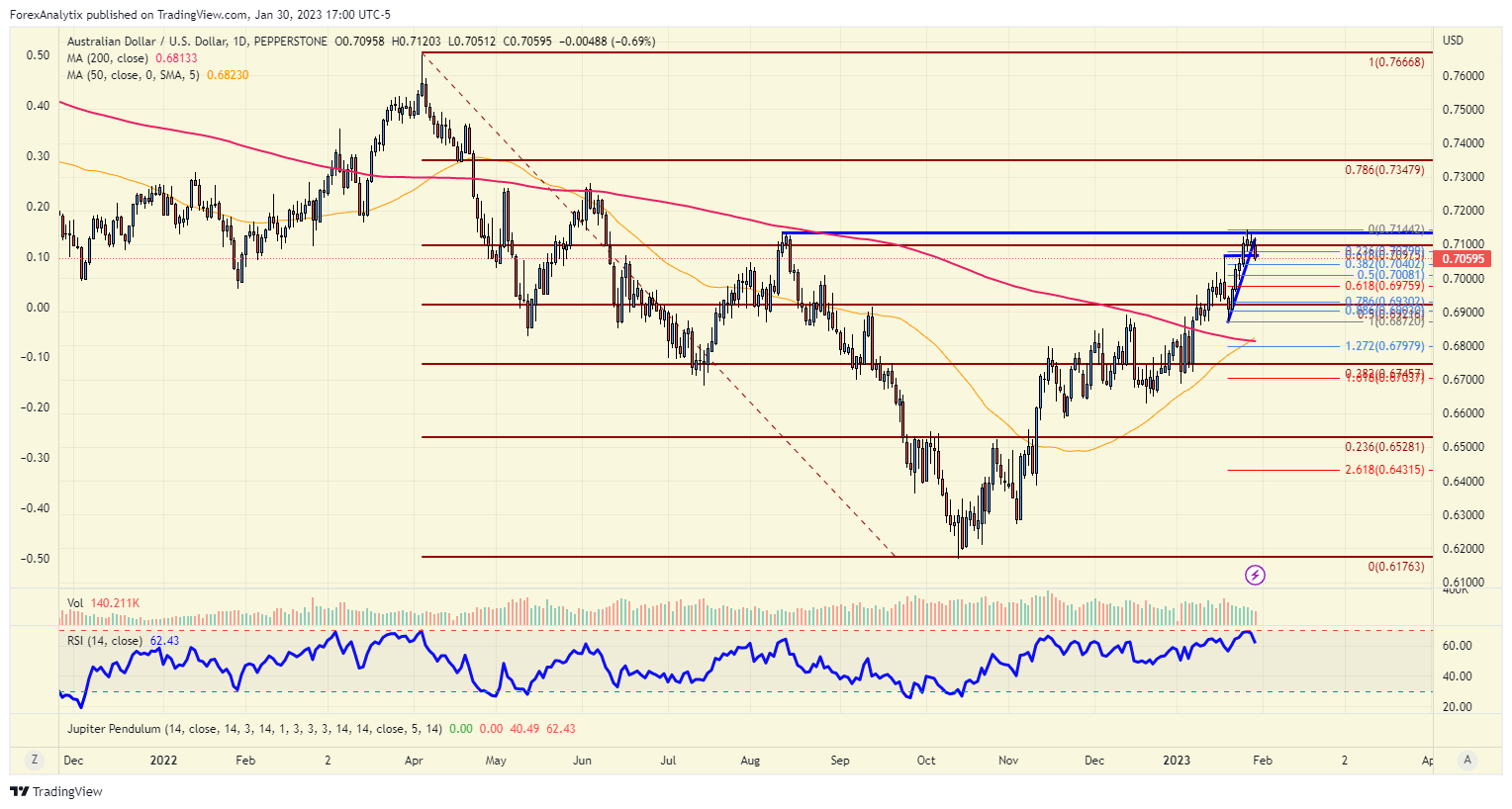 此外,从2022年4月的高点到2022年10月的低点之间长期跌势的61.8%斐波那契回撤位略低于0.7100。