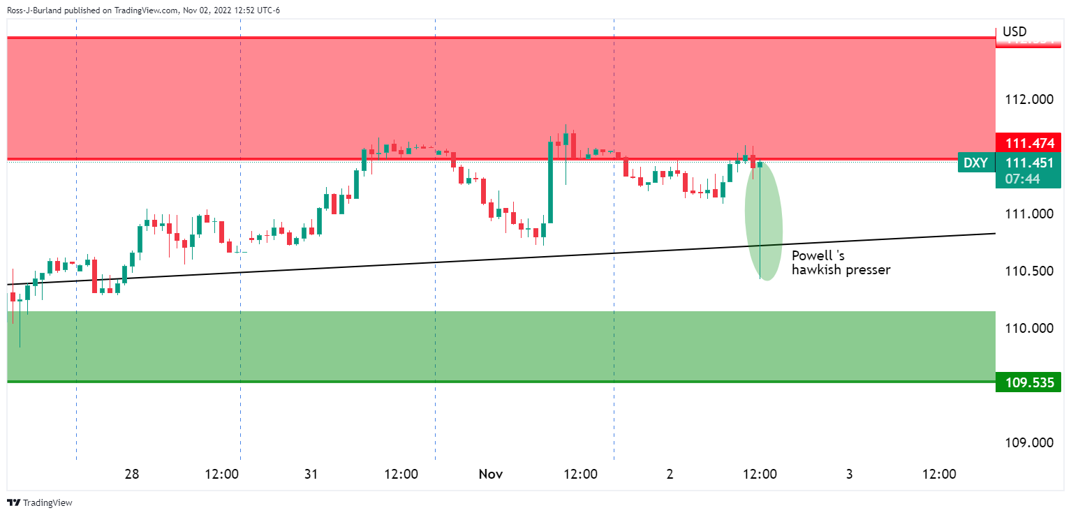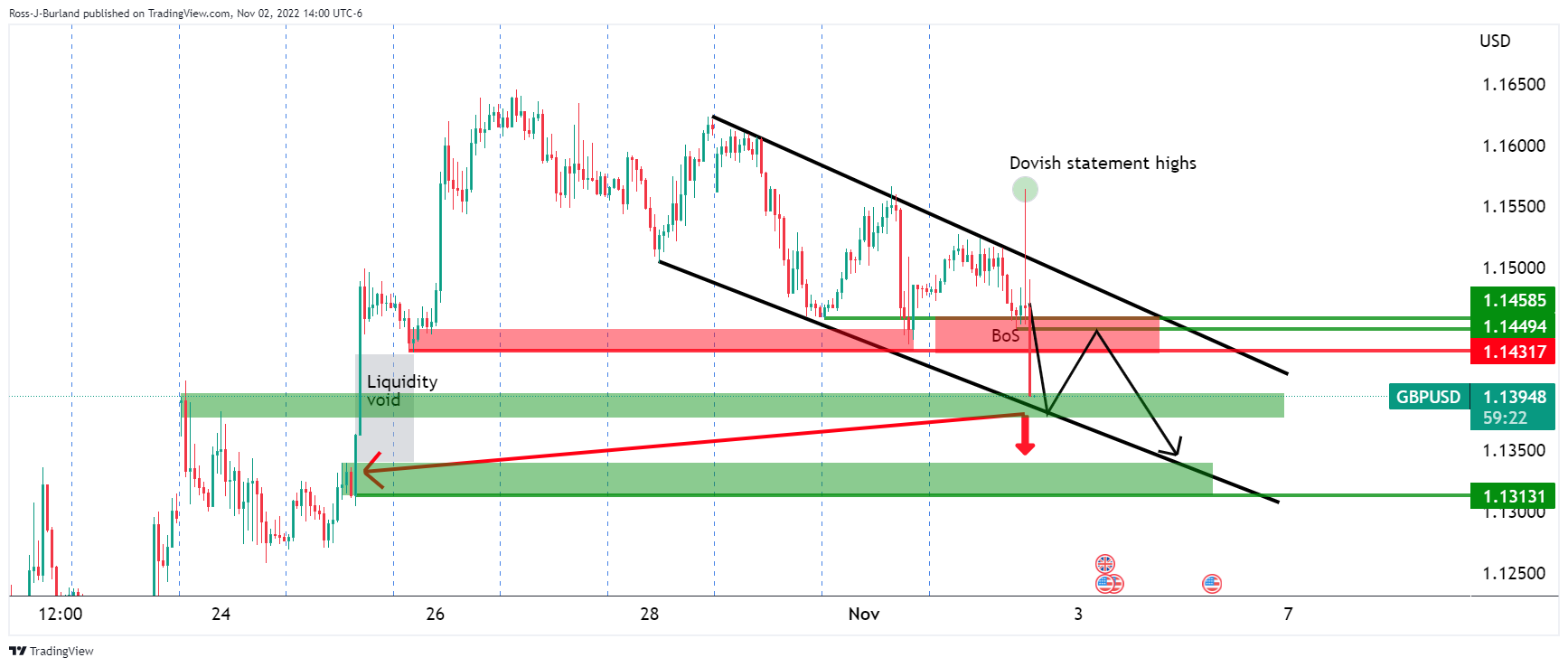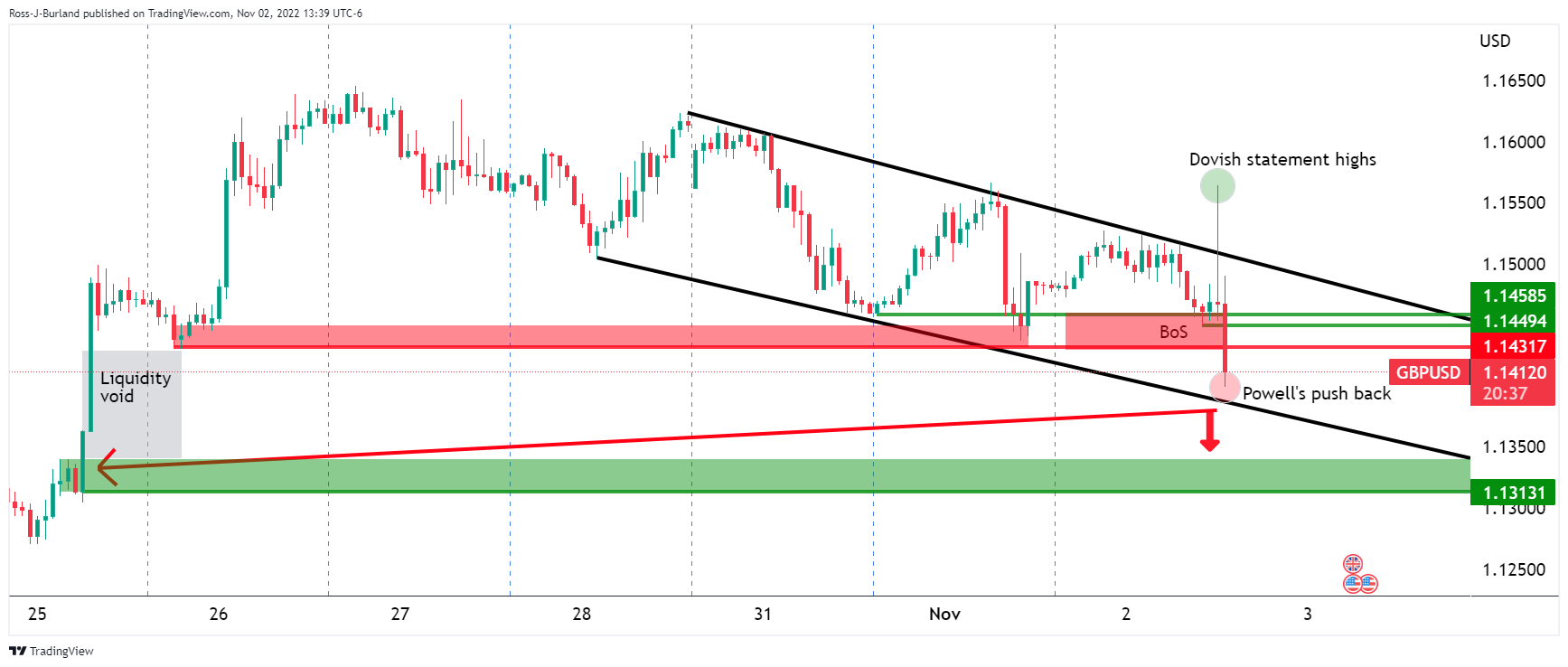 美联储主席鲍威尔在新闻发布会上发表讲话时谈及调整政策的节点,打压处在上涨当中的风险市场,英镑/美元跌至支撑水平。然而在跌破支撑后,由于流动性缺乏,未出现10月25日那样的反弹。
