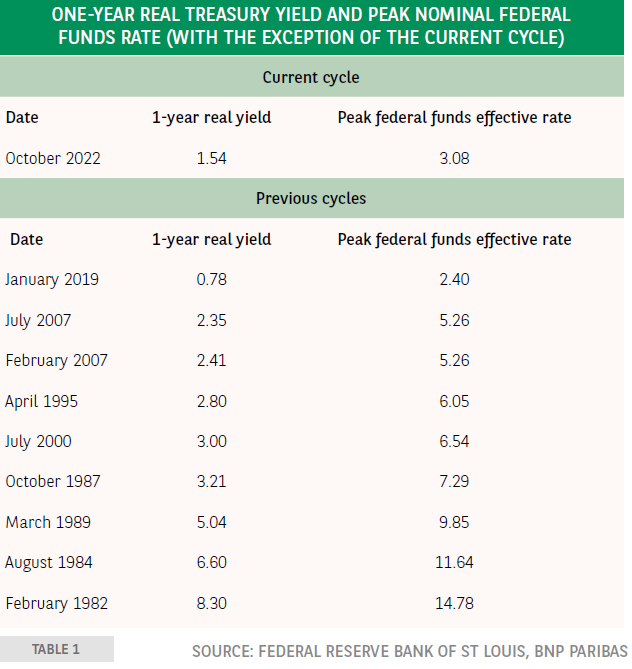 美联储会在什麽水平停止提高联邦基金利率?这个问题对美国经济的活动和需求以及金融市场都极為重要。在最近的新闻发布会上,美联储主席杰罗姆·鲍威尔对联邦公?市场委员会的反应功能含糊其词,但他确实提到了他们将关注实际利率。这就提出了一个问题,用哪种通胀指标来从名义利率转向实际利率?一个可能的解决方案是使用克利夫兰联邦储备银行(Federal Reserve Bank of Cleveland)计算的通胀预期期限结构。侭管最近大幅上涨,但除2018年外,一年期实际国债收益率仍低于前几次紧缩周期期间达到的水平。在通胀上升的背景下,紧缩周期显然不会结束。侭管美国1年期国债的实际收益率最近大幅上升,但仍低于此前紧缩周期期间达到的水平。美联储的工作还没有结束。