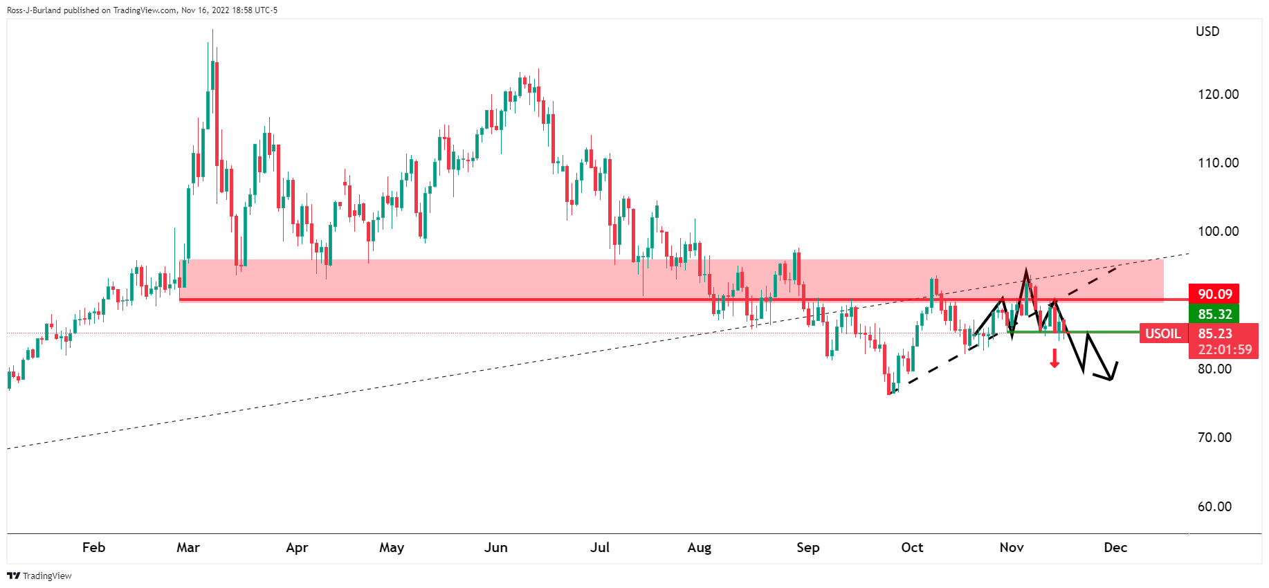 日缐图显示WTI油价处在看跌头肩形态,这一形态处在小型趋势缐的背面: