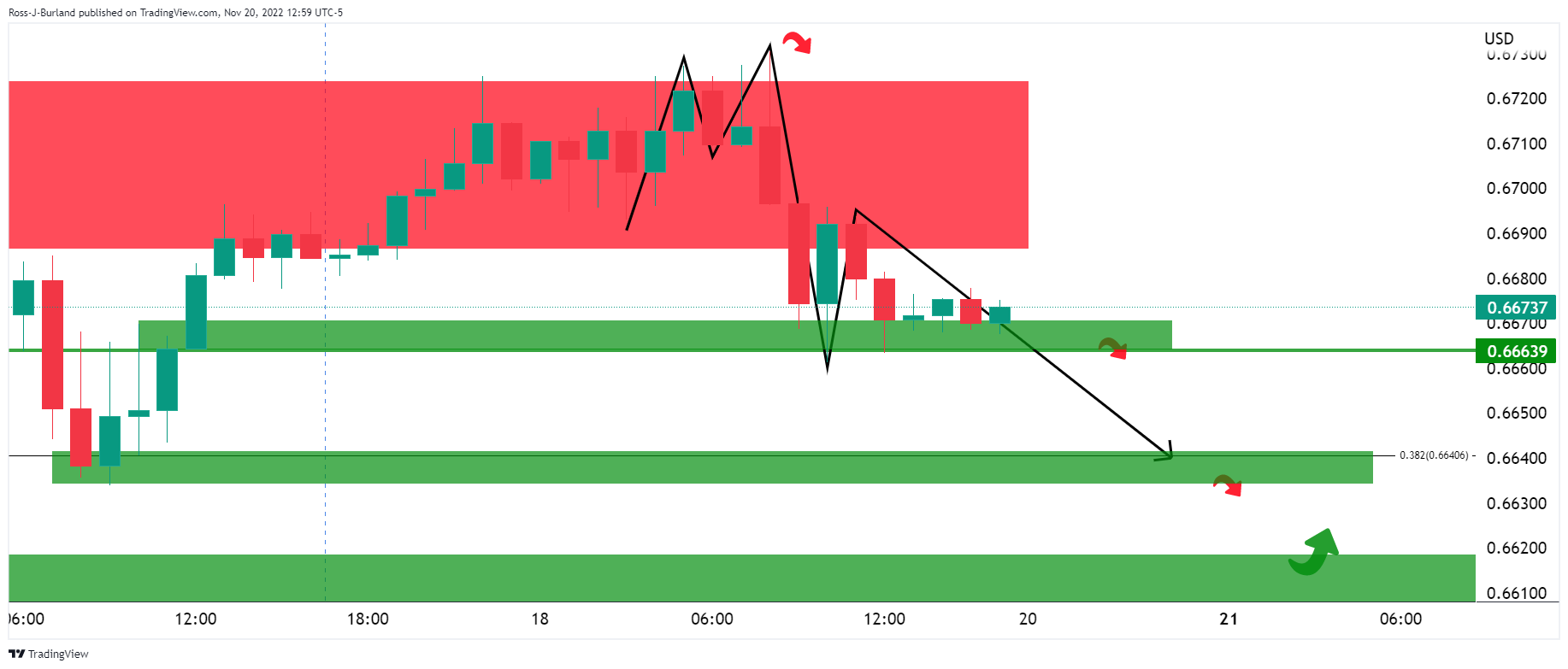 根据之前的分析,澳元/美元价格分析:?盘空头寻求看跌突破,澳元/美元确实出现下跌,如下图所示。