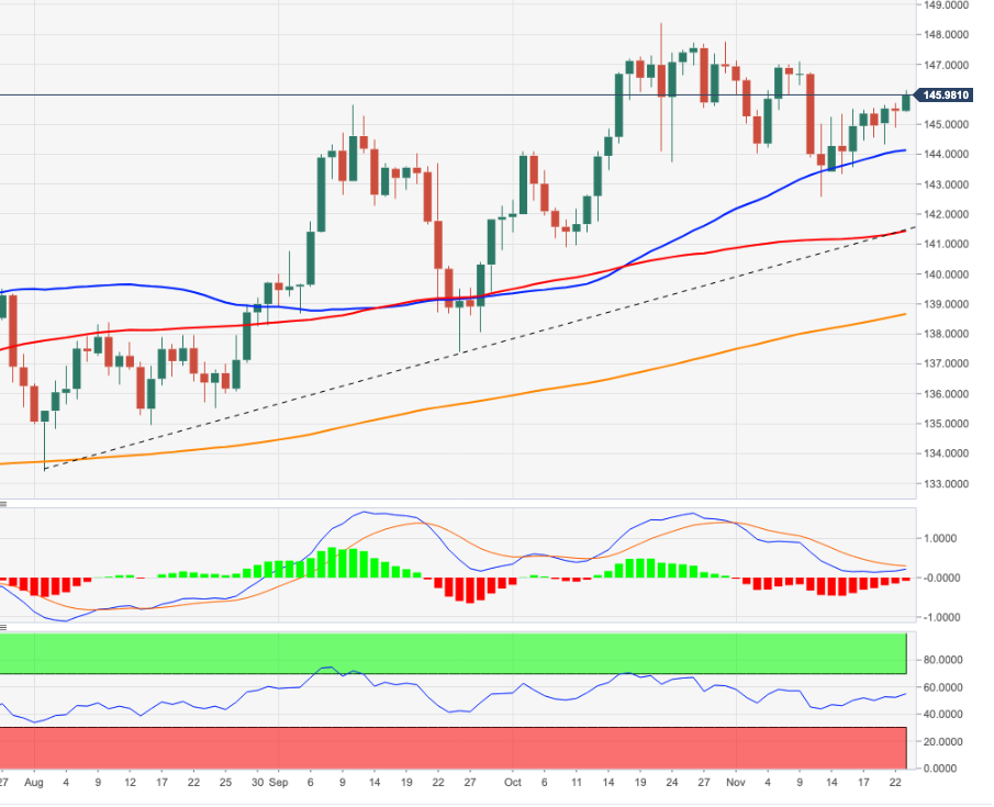 到目前為止,修正反弹看起来维持良好,该交叉盘应该会在截至目前的11月高位147.11(11月9日)处面临初步阻力。在后者之上,可能会打?看向2022年的峰值148.40(10月21日)的大门。