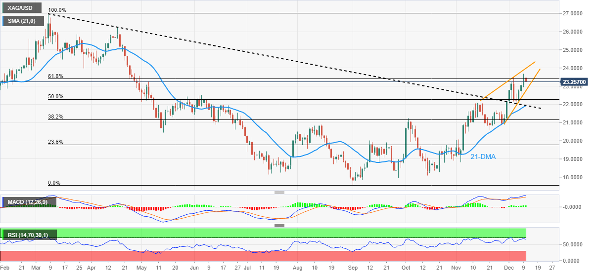 值得注意的是,相对强弱指标(14)超?状况且银价未处在3 - 9月跌势的61.8%斐波位(23.40美元附近)上方,吸引空头。一个月楔形形态不断上升也让空头充满希望。