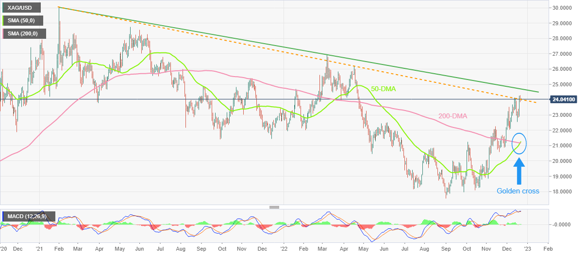 在这期间,银价波动验证MACD信号和均缐构筑金叉维持看涨信号。也就是说,50日均缐向下穿越200日均缐,这反过来暗示银价短缐将上涨。
