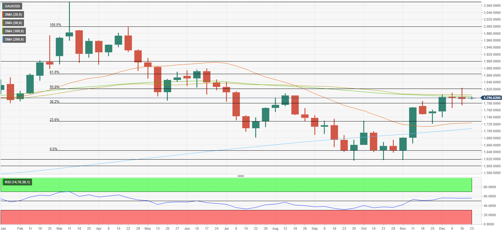 此外,通货膨胀在今年第三季度?始持续下降,11月的年度CPI和核心CPI分别為7.1%和6%。在今年的最后一次政策会议上,美联储将其政策利率提高了50个基点,至4.25-4.5%的范围。经济预测摘要(SEP),所谓的点阵图显示,政策制定者的终端利率预测中值从9月的4.6%上升到5.1%。侭管鹰派的点阵图帮助美元限制其跌势,但随著10年期美国国债收益率在12月上旬稳定在3.5%左右,金价并不难守住其阵地。
