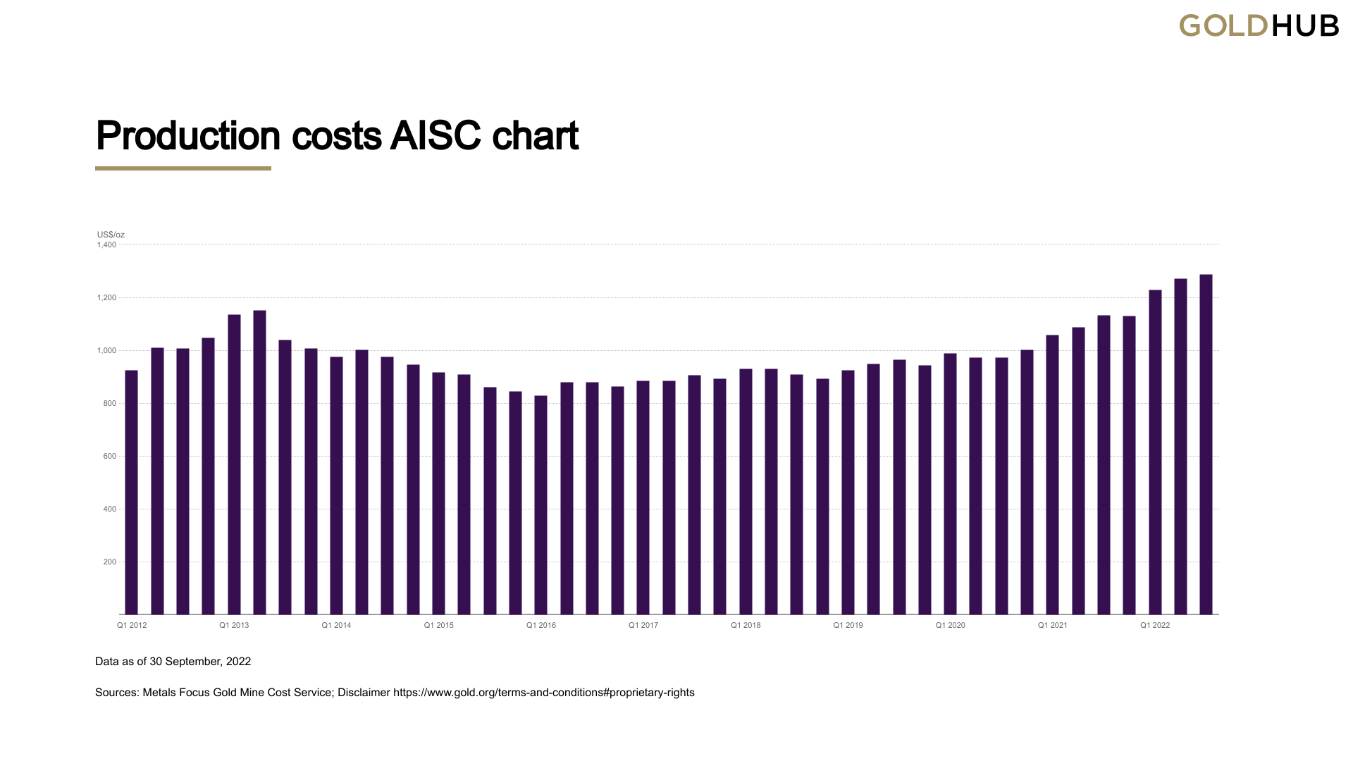 下图显示了每盎司黄金的 "全部维持成本(AISC)"的变化,这是一个行业特定的指标,被广泛用于衡量总支出。最新的数据显示,AISC在第二季度达到了1289美元/盎司的历史新高,反映了近20%的年度增长。世界第二大黄金?采商巴里克黄金公司(Barrick Gold Corp)在11月初表示,9%的产量下降转化為该公司第三季度年度AISC的22.7%增长。