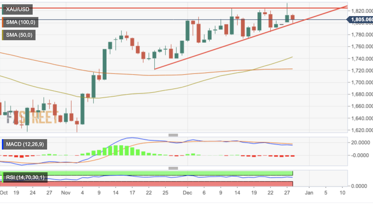 周三欧洲交易时段,黄金期货从周二的高点1833美元回落后,正在测试1800美元关口的支撑位。过去两周,金价一直在1,825美元上方徘徊,此前从11月中旬接近1,600美元的低点反弹了12%。