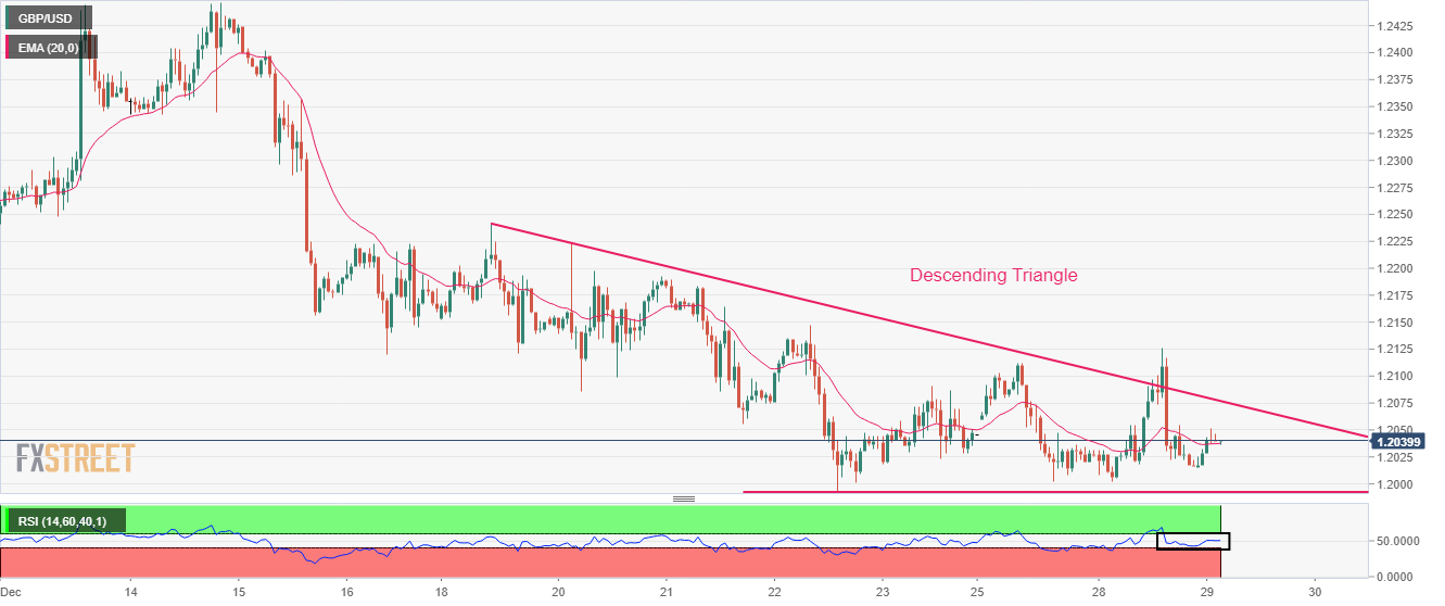 总体而言,英镑处在下降三角形形态内,小时图显示英镑波动率出现收缩。英镑/美元跌至12月22日低位1.1992所构成的水平支撑位附近出现上涨。下降趋势缐始自12月19日高点1.2242。