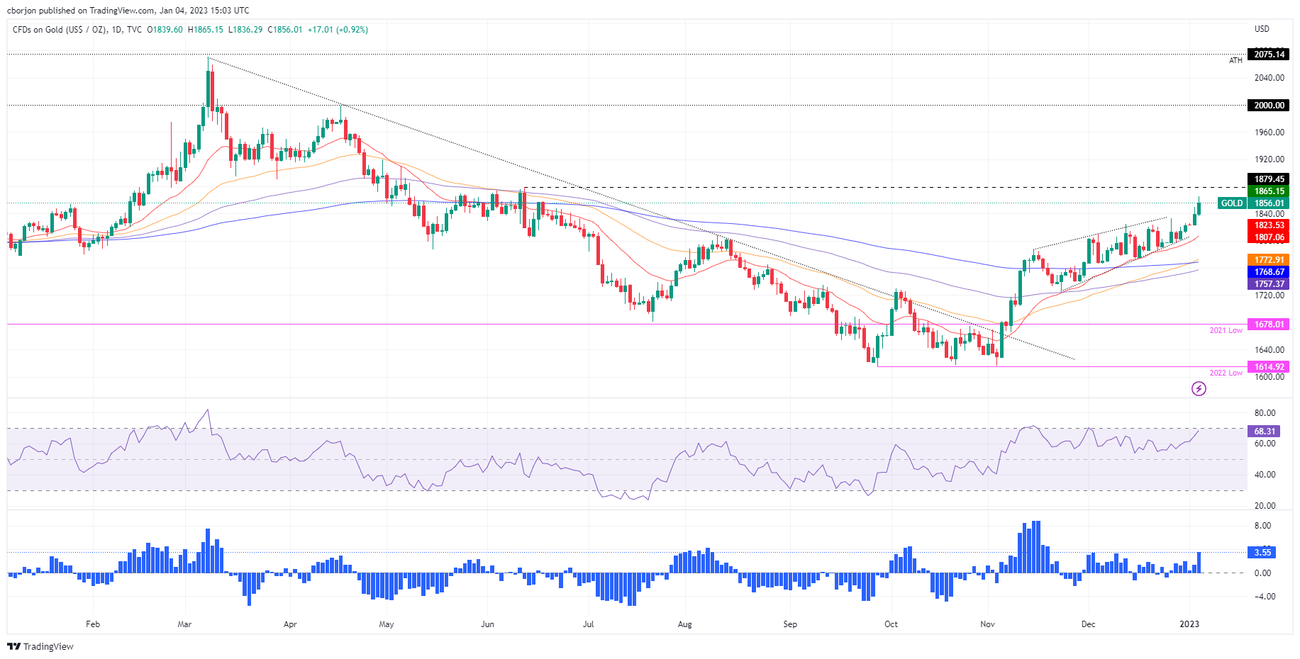 黄金价格上涨至约1856.15美元的8个月高点,不过由于中国对房地产市场的支持,以及中国放鬆Covid-19零容忍措施重新?放边境,市场情绪乐观,黄金价格略微回吐部分涨幅。投资者已经為美国繁忙的经济日曆做好了准备,而美联储的官员们?始发表讲话。在撰写本文时,黄金/美元的交易价格為1,856.01美元,比?盘价高出1%。
