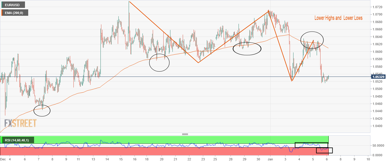 小时图显示,由更低的高点和更低的低点所构筑的看跌趋势是明确的。前期200周期指数移动均缐(EMA) 1.0610将构成强支撑,目前已经构成阻力。