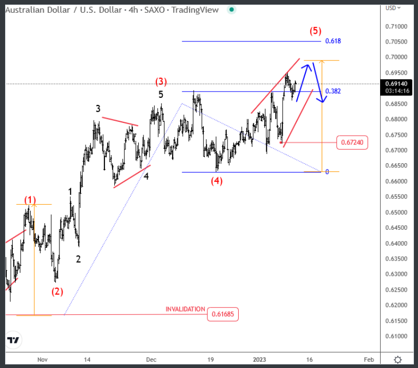 澳元/美元:看涨推动,目前第五浪逼近0.70的阻力位