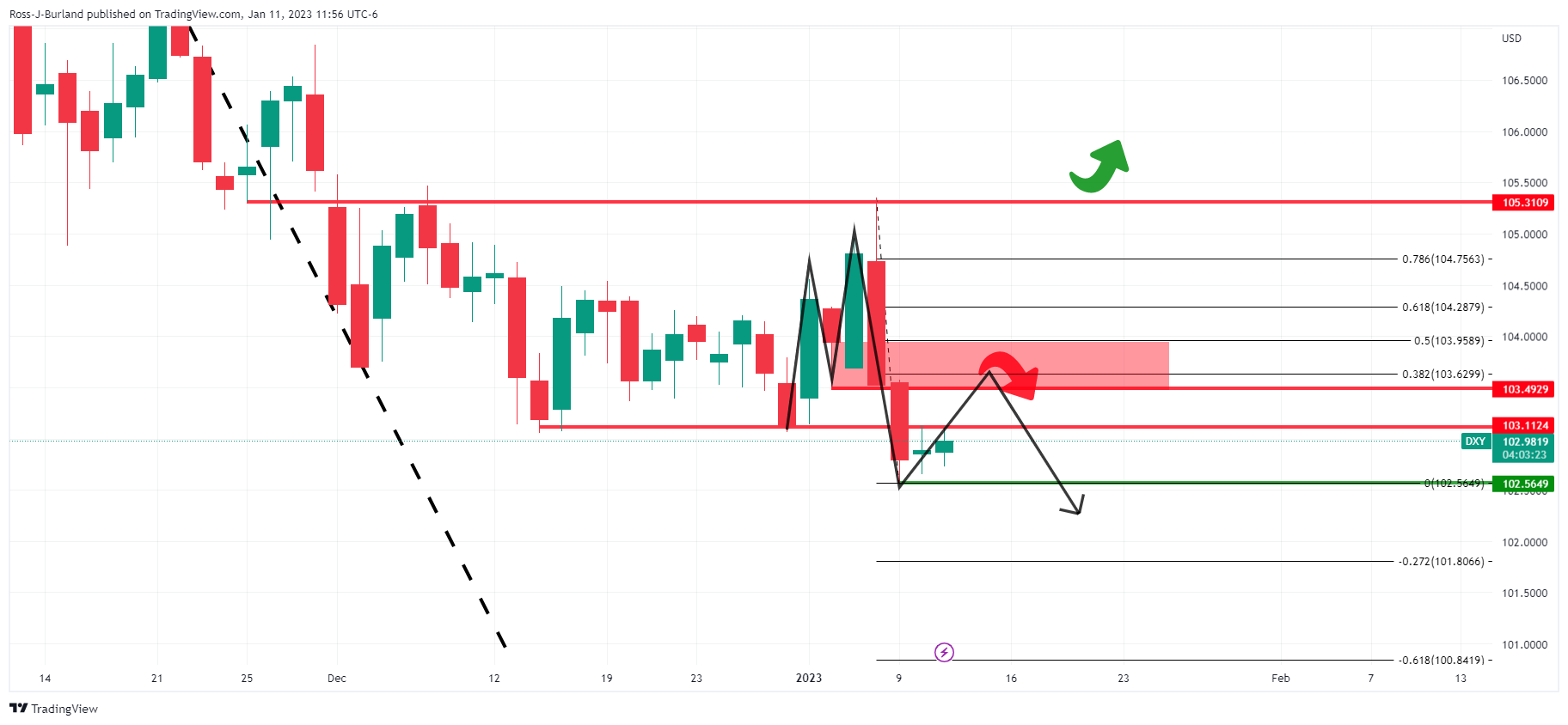 M形态為反转形态,预计美元指数将重测阻力形态和103.50 - 104.00区间的颈缐位。这样的波动将使得汇价依次测试38.2%斐波位和50%斐波位。