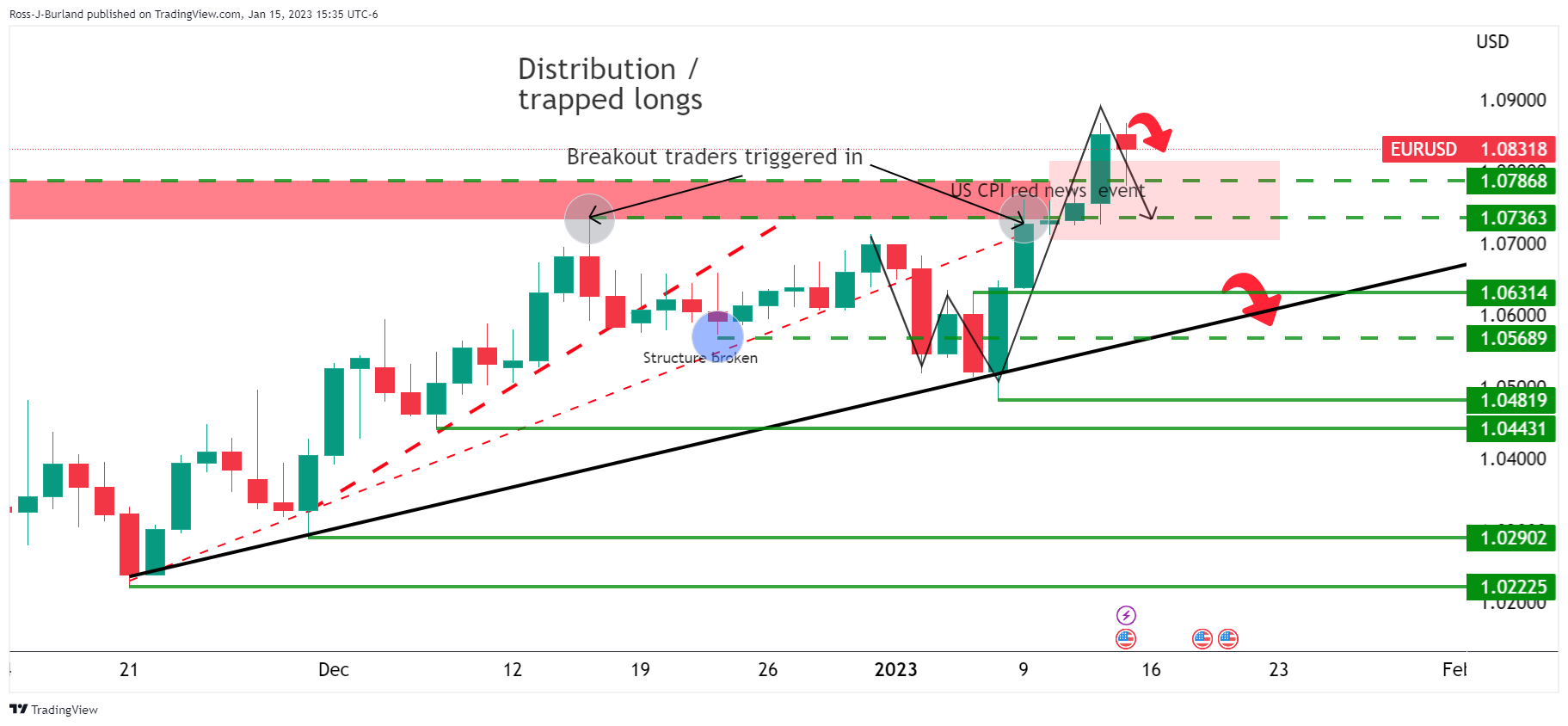 此后,欧元/美元格停滞不前,有望再次测试1.0780,并下跌接近1.0700。然而,空头需要欧元/美元在小级别周期跌破趋势缐支撑,例如以下4小时图所示: