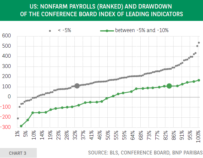 世界大型企业联合会(Conference Board)的指数与就业创造之间的历史相关性,可以让我们对此有所了解。图表2显示了领先指标指数(自历史峰值以来百分比下降)与月度非农就业人数之间的关係。如果前者在未来几个月继续下降,基于过去的关係,人们应该预计每月创造就业的速度将进一步放缓。